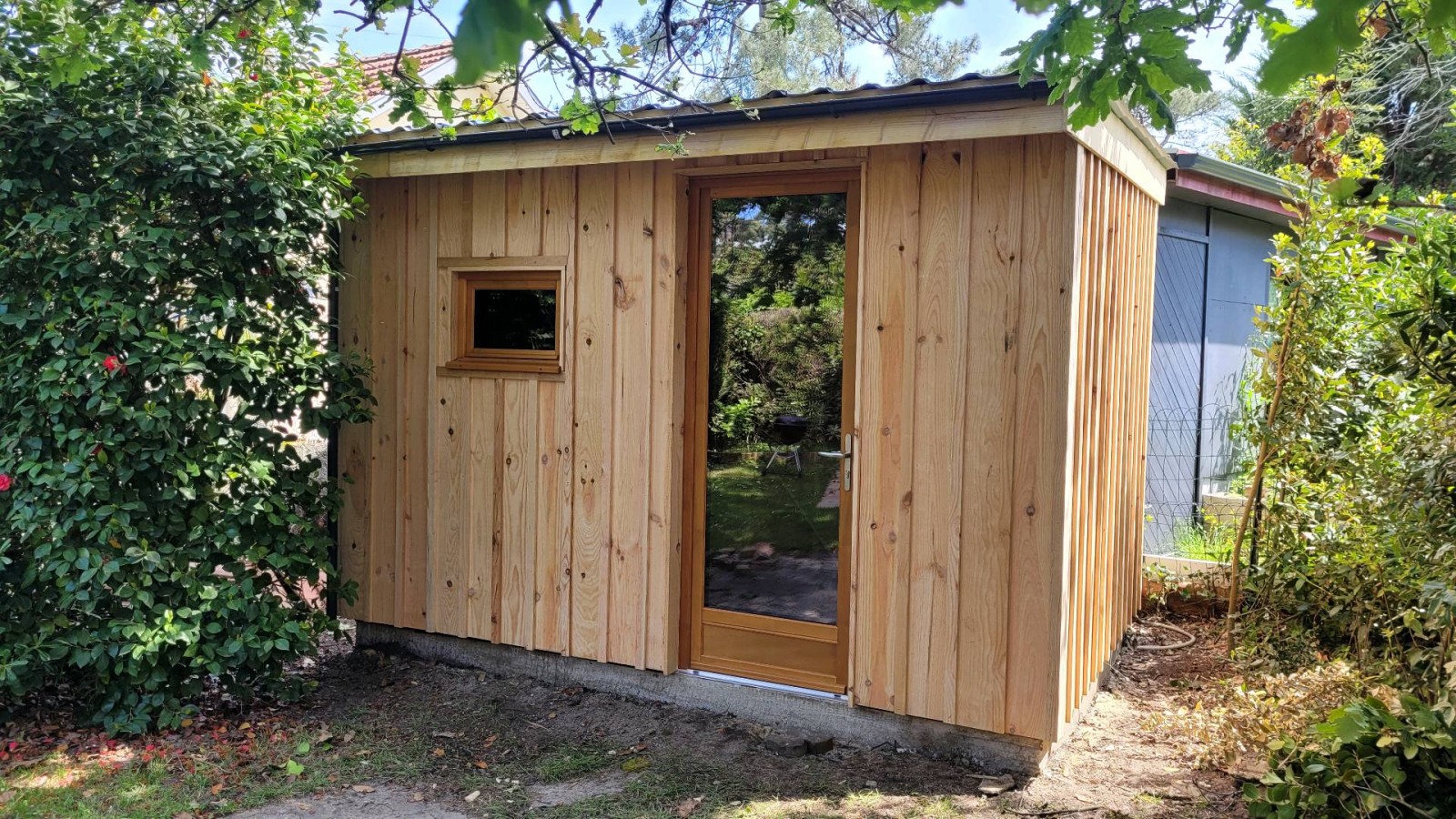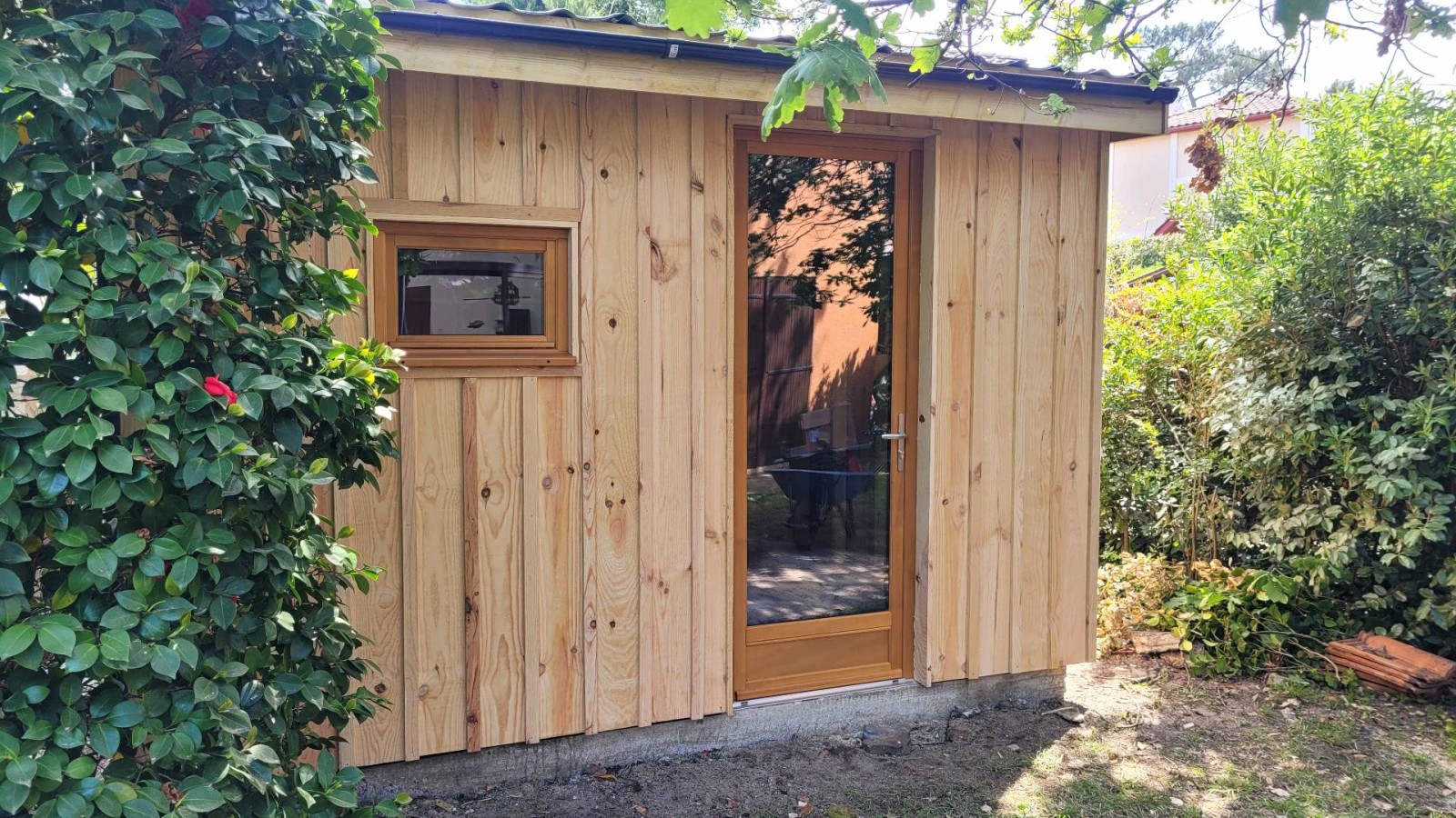 Ce chalet en bois typique du bassin d'Arcachon avec un joli bardage en volige couvre joint, mono pente avec couverture bac acier permet un grand rangement et créer un espace de stockage supplémentaire à l'extérieur tout en protégeant vos affaires.