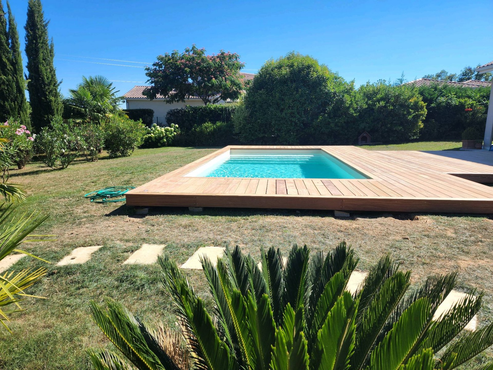 Ce bois exotique s'intègre parfaitement dans ce beau jardin et habille cette piscine qui n'attendait que ça.