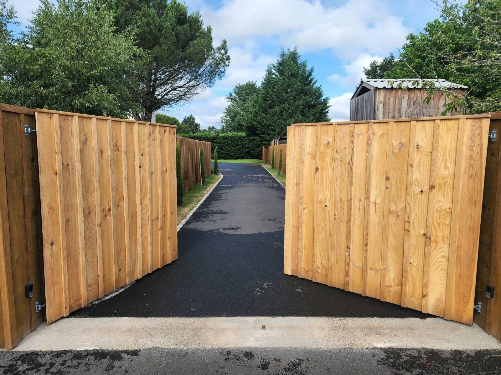 Ici l'accès ne permettant pas la pose d'un portail coulissant le portail battant à donc été choisi.