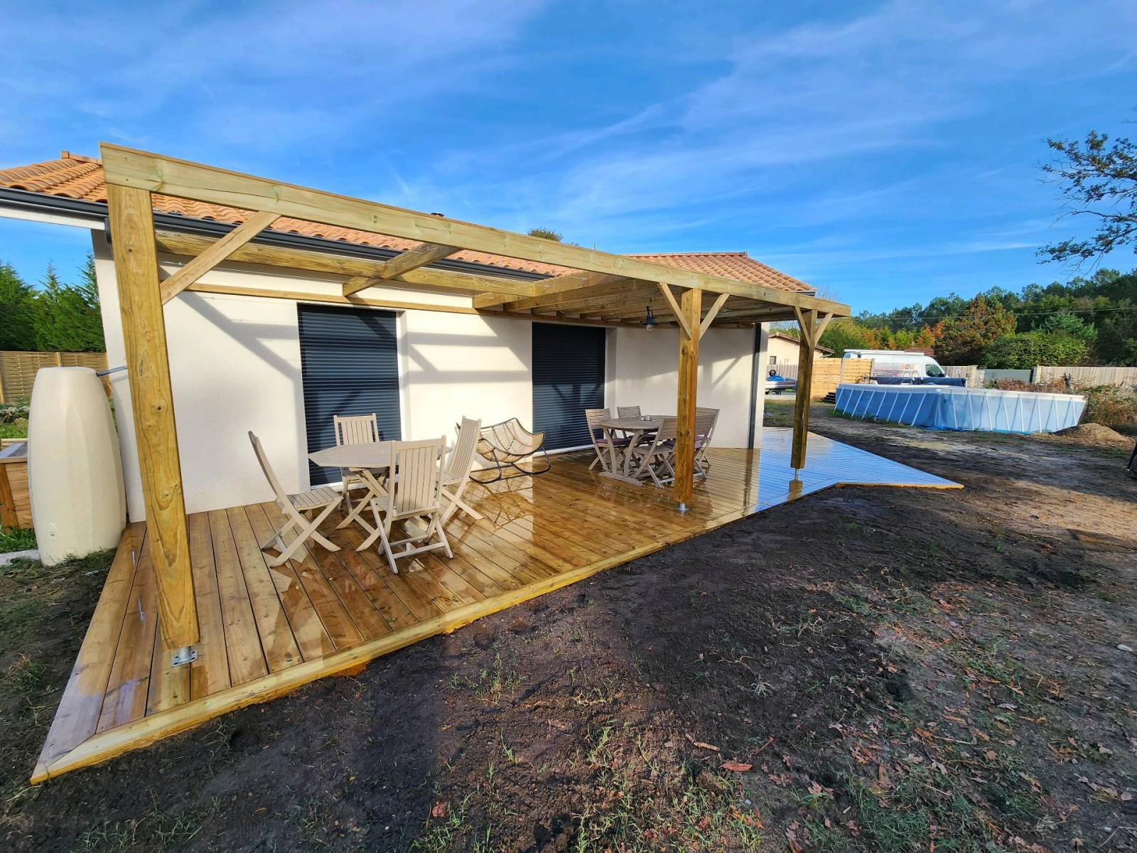 C'est chose faite, pose d'une terrasse bois autoclave sur double structure d'une surface de 45m2 ainsi que la conception et fabrication puis la pose d'une magnifique pergola en bois